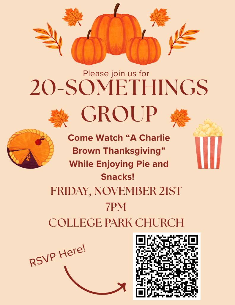Are you in your 20s and looking for community? Come join the 20-Somethings Group at College Park! The group will be watching a movie and enjoying some snacks on Friday night, November 21st in our Youth area. (Please use door 1) Come join the fun!