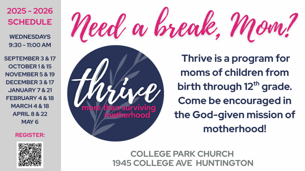 Thrive: More than Surviving Motherhood is a program to encourage moms with kids of any age living at home to THRIVE in the God-given mission of motherhood. This free program includes speakers, video content, discussion, a great time to connect with and encourage each other, fun giveaways, coffee, and snacks! Invite your friends! Thrive meets on scheduled …