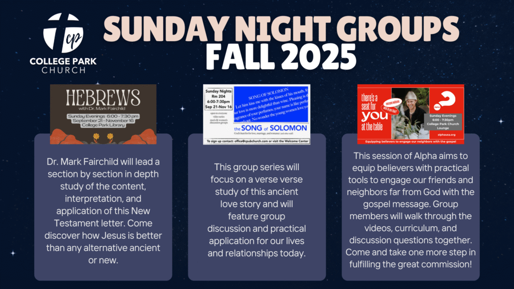 College Park is the place to be on Sunday nights! In addition to children’s and youth programming, we will have three adult groups to chose from. …