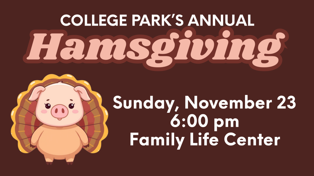 Our 4th annual Hamsgiving is coming soon! Hamsgiving is College Park’s Thanksgiving celebration – with a twist! Join us on Sunday evening, November 23, for an all church potluck dinner. The church will provide hams, and we ask that those attending to bring a side dish that contains PORK!